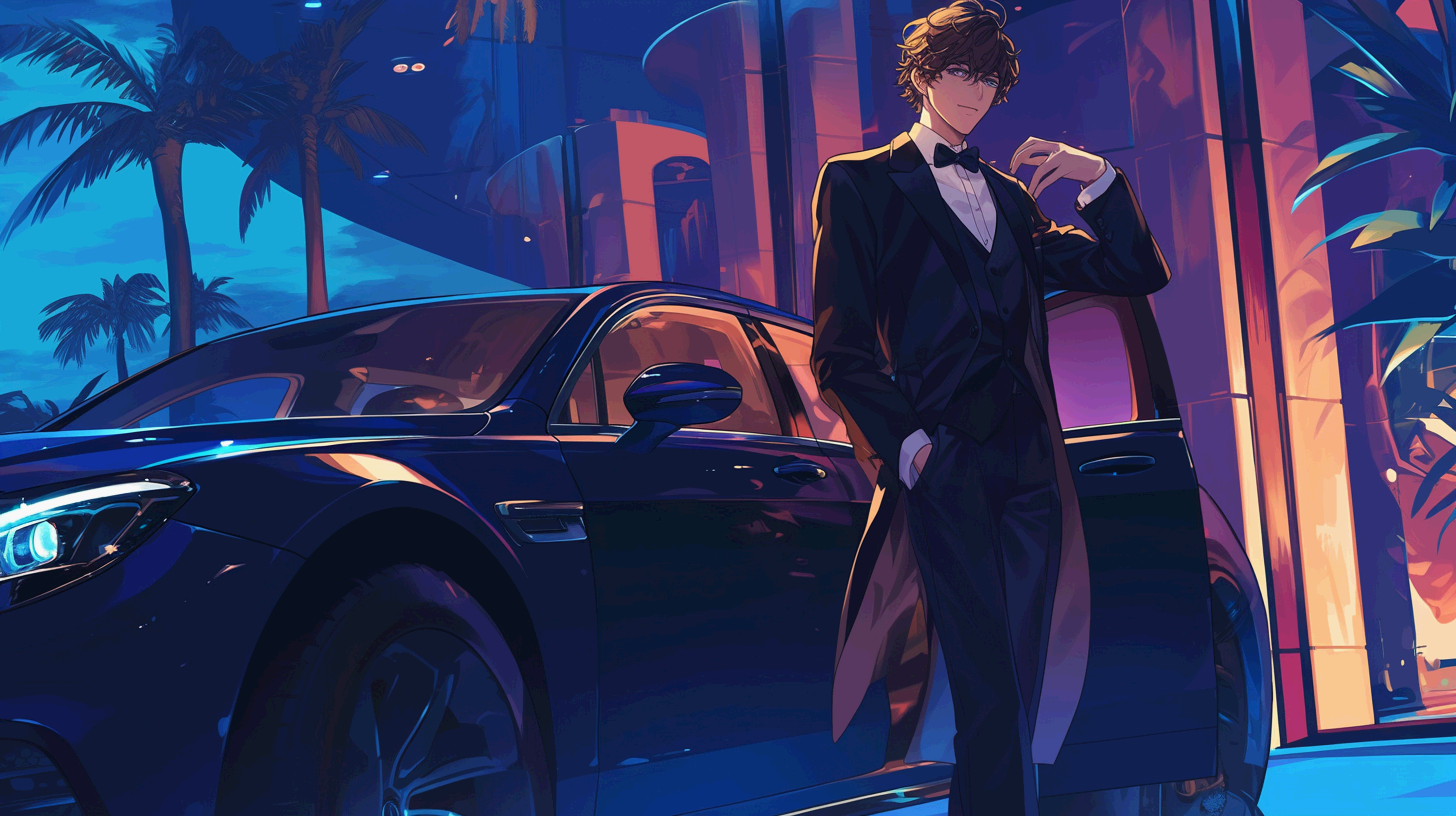 Elegant scene, famous actor standing confidently next to a luxury car, smiling at the camera, exquisite detail on the car's design highlighted, niji style with vivid lighting. --ar 16:9 --niji 6
